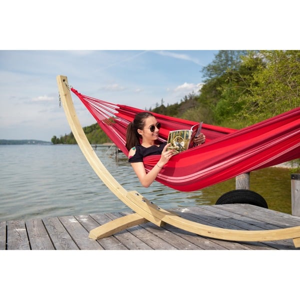 Das Appollo Set Fuego beinhaltet die Salsa Hängematte und das Gestell Apollo. Die Salsa ist eine wetter- und UV-beständige Hängematte, die mit einer Liegefläche von 210 x 140 cm und einer Tragkraft von bis zu 150 Kilogramm auch für mehrere Personen geeignet ist. Sie besteht aus EllTex-Material (Extra Long Lasting TEXtile), das aus 55% Baumwolle und 45% Polyester hergestellt wird, Umwelteinflüssen standhält aber dennoch kuschelig weich ist. Passend dazu ist das Gestell Apollo im Lieferumfang enthalten um die Hängematte aufzuhängen. Das nachhaltige Fichtenholz ist Tauchbadimprägniert und besitzt verzinkte Beschläge, damit es wetterfest bleibt.Art.-Nr.: 1593354