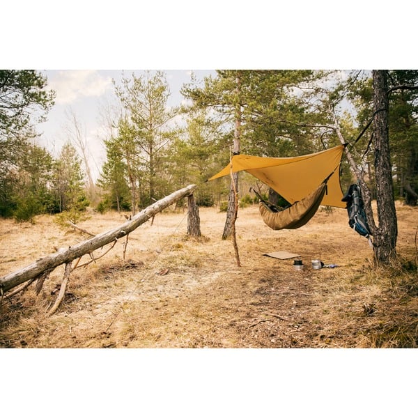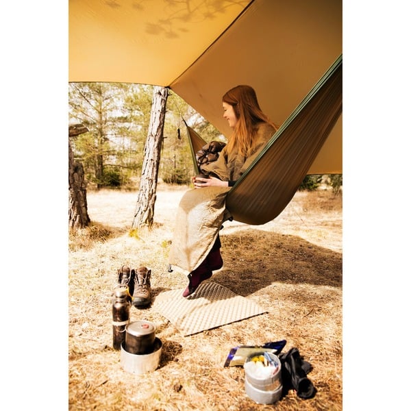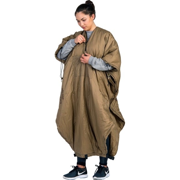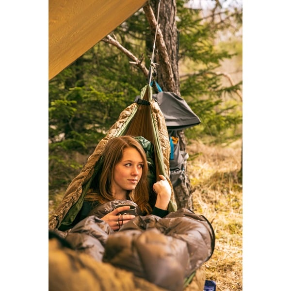 Die Hängematte auch bei kaltem Wetter benutzen und auch am Lagerfeuer nicht frieren? Mit dem Underquilt-Poncho kann man seiner Ultraleicht-Hängematte den perfekten Wärmeschutz von unten geben. Einfach unter die Hängematte spannen und fertig! Die Thermolite Mikrofaserfüllung wärmt optimal, ist weich wie Daunen und stark komprimierbar für ein kleines Packmaß. Durch seinen eingebauten Reißverschluss kann man den Underquilt-Poncho blitzschnell in einen wärmenden Poncho verwandeln: Reißverschluss öffnen, den Underquilt-Poncho über den Kopf ziehen, zuknöpfen, fertig. Auf der Vorderseite befindet sich ein kleines Verstaufach für Smartphone & Co. Inklusive stufenlos verstellbarer, abnehmbarer Aufhängeseile und Straps zur Befestigung direkt unter der Hängematte.Art.-Nr.: 1487982