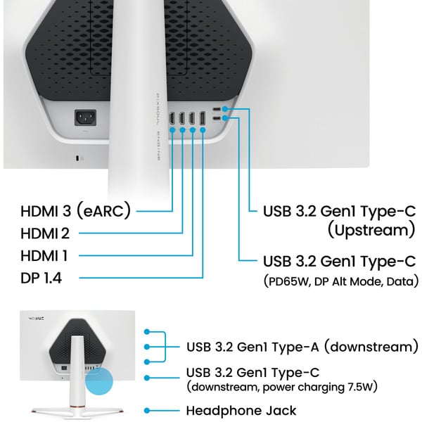 Features USB-C Power Delivery 65 Watt, AMA, Brightness Intelligence Plus Gen2, Farbschwäche, Low Blue Light, Flicker-free, HDRi, KVM Switch, Videoformat Unterstützung, Motion Blur Reduktion, Color Vibrance, Light Tuner, Color Shuttle Software, Display Quickit, eARC, Gamer-Experienced Color-Technologie, AI Shadow Phage, PixSoul Engine