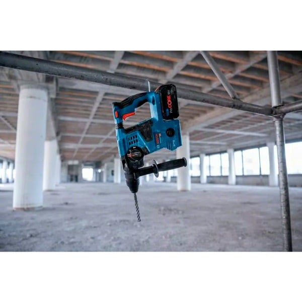 Der Bosch Akku-Bohrhammer GBH 18V-28 CF Professional ist ein Allrounder, perfekt geeignet für den täglichen Arbeitseinsatz. KickBack Control und Vibration Control sorgen für einen höheren Verletzungsschutz für den Benutzer. Die Schnellabschaltung Kickback Control bietet eine bessere Kontrolle über das Werkzeug, bei plötzlicher und unvorhersehbarer Rotation des Bohrhammers um die Bohrerachse, z.B. bei klemmenden Bohrern, schaltet das Elektrowerkzeug ab. Der bürstenlose Motor gewährleistet hohe Qualität und eine lange Lebensdauer. Die integrierte LED-Lampe erhellt auch dunkle Arbeitsbereiche. Der GBH 18V-28 CF Professional verfügt über einen Zusatzhandgriff, einen Tiefenanschlag und eine Sicherheitsrutschkupplung. Sein eingebautes Bluetooth Connectivity-Modul bietet eine schnelle und einfache Verbindung mit der Bosch Toolbox App für individuelle Einstellungen. Das User Interface bietet echte Vorteile dank deutlicher Anzeige des Akkustatus und Visualisierung des Arbeitsmodus. Die drei Arbeitsmodi (Auto, Favorite, Soft) sind über das Interface leicht zugänglich und intuitiv einstellbar. Das Schnellwechselfutter ermöglicht werkzeuglose Aufsatzwechsel mit kürzeren Arbeitsunterbrechungen. Der GBH 18V-28 CF Professional ist außerdem mit dem in sich geschlossenen Staubabsaugsystem GDE 18V-16 Professional kompatibel, das mit nur einem Klick am Bohrhammer befestigt werden kann. In diesem Angebot sind außerdem zwei ProCORE18V Akkus enthalten, die durch neueste Zellentechnologie mit der gleichen Leistung wie Standardakkus aufwarten können, allerdings bei erheblich kleineren Abmessungen, geringerem Gewicht und 135% mehr Lebensdauer als ein Standardakku – dank COOLPACK 2.0-Technologie, durch die ein Überhitzen des Akkus vermieden wird. Die Akkus sind Teil der AMPShare Alliance. Ein einziger Akku passt für alle Werkzeuge und Maschinen im blauen Bosch Professional 18V System, kann aber auch markenübergreifend mit zahlreichen weiteren Geräten anderer Hersteller aus der AMPShare Alliance verwendet werden. Nie mehr neue Akkus für jedes neue Werkzeug kaufen, nie mehr nach dem „richtigen“ Akku suchen, mit AMPShare reicht ein Akku für alle Arbeiten.Art.-Nr.: 100011963