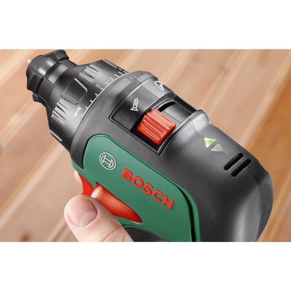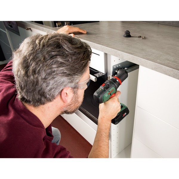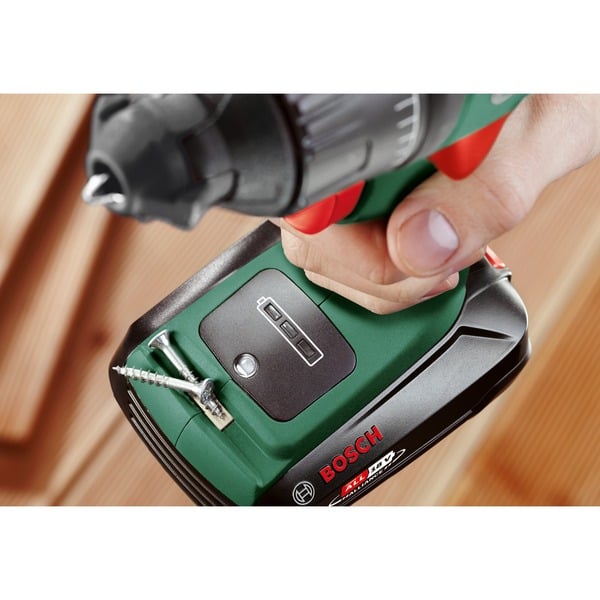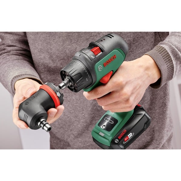 Der Akku-Bohrschrauber AdvancedDrill 18 von Bosch ist außergewöhnlich intuitiv und vielseitig einsetzbar. Die Wahl des gewünschten Modus zum automatischen Einstellen der Gänge zum Schrauben oder Bohren ist denkbar einfach. Die intuitive Wahl der Betriebsart erleichtert das Umschalten zwischen Schraub- und Bohrfunktion. Die Gänge werden je nach gewählter Betriebsart automatisch eingestellt und perfekt auf die Anwendung abgestimmt. Dank des innovativen elektronischen Schaltsystems mit LED-Licht kann die Drehrichtung mit einem einfachen Klick gewechselt werden. Das LED-Licht zeigt deutlich an, ob der Bohrschrauber sich gerade vorwärts oder rückwärts dreht. Der bürstenlose Motor bietet mehr Leistung, Kompaktheit und Langlebigkeit. Er wird elektronisch gesteuert, hat eine geringere Wärmeabgabe, funktioniert kontakt- und verschleißfrei und arbeitet mit optimaler Effizienz. Der Bohrschrauber verfügt über verschiedene QuickSnap-Aufsätze: Der Exzenter- und der Winkelaufsatz zur Bewältigung von Arbeiten an schwer zugänglichen Stellen, die Magnetkappe und das 13mm-Futter zum einfachen Umschalten zwischen Bohr- und Schraubarbeiten. Mit der Schraubengarage sind die Kleinteile immer sofort zur Hand. Ein Magnet am Werkzeugfuß hält Schrauben und Bits griffbereit fest. Der Bohrschrauber AdvancedDrill 18 ist der kompetente Allrounder für verschiedenste Bohr- und Schraubarbeiten in Holz, Metall und Kunststoff. Dank Lithium-Ionen-Technologie gibt es keinen Memory-Effekt und keine Selbstentladung, der Akku ist immer einsatzbereit.Art.-Nr.: 1826987