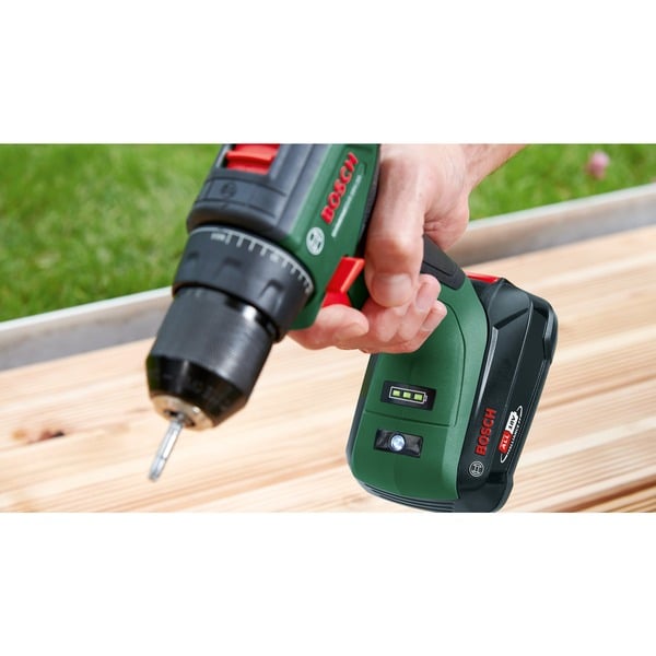 Der Akku-Bohrschrauber UniversalDrill 18V-60 von Bosch bietet Kraft und Präzision. Das hilfreiche kabellose Werkzeug verfügt über ein 2-Gang-Planetengetriebe und 20 Drehmomentstufen plus Bohrstufe für optimales Drehmoment beim Schrauben und ideale Geschwindigkeit beim Bohren. Der langsame starke erste Gang ist ideal zum Schrauben und Bohren größerer Durchmesser, während der zweite Gang einen schnellen Bohrfortschritt bei kleinen Durchmessern ermöglicht. Dank des einhülsigen 13-mm-Bohrfutters mit Auto-Lock können die Bohrer und Schrauberbits mühelos gewechselt werden. Der kompakte Bohrschrauber mit ergonomischem Design ist außerdem mit einem eingebauten LED-Arbeitslicht ausgestattet, um die Sicht an dunklen Stellen zu erleichtern. Der bürstenlose Motor vereint eine deutlich längere Lebensdauer mit mehr Leistung. Er wird elektronisch gesteuert, hat eine geringere Wärmeabgabe, funktioniert kontakt- und verschleißfrei. Der Bohrschrauber UniversalDrill 18V-60 ist der kompetente Allrounder für verschiedenste Bohr- und Schraubarbeiten in Holz, Metall und Kunststoff. Dank Lithium-Ionen-Technologie gibt es keinen Memory-Effekt und keine Selbstentladung, der Akku ist immer einsatzbereit. Der Akku-Bohrschrauber UniversalDrill 18V-60 ist Teil der POWER FOR ALL ALLIANCE. Ein einziger Akku kann eine Vielzahl von Geräten verschiedenster Marken betreiben.Art.-Nr.: 1876110