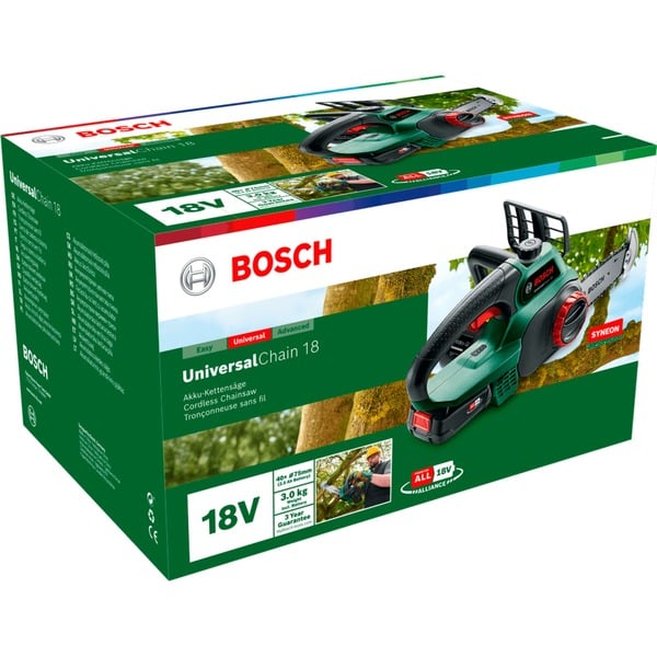 Bosch Akku-Kettensäge UniversalChain 18, 18Volt (grün/schwarz, Li-Ionen Akku 2,5Ah, POWER FOR ALL ALLIANCE)