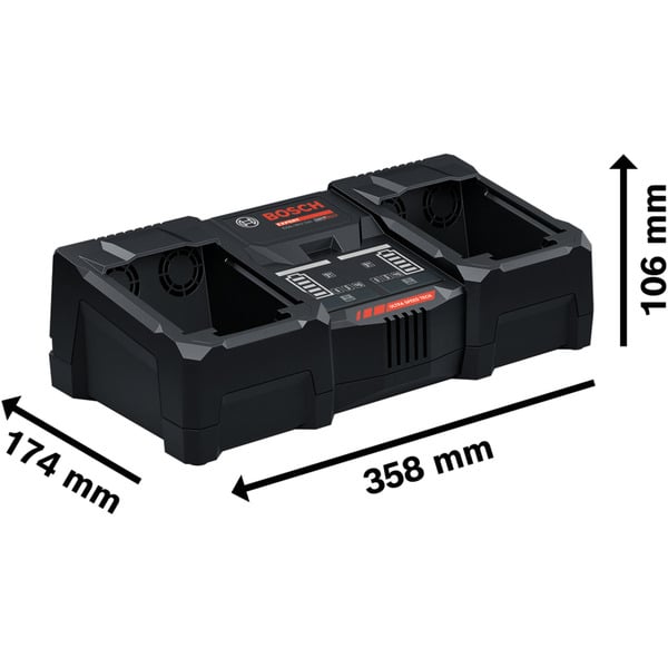 Das Bosch Expert EXAL18V2-320 ist ein ultraschnelles Ladegerät für alle 18V-Akkus von Bosch und von den AMPShare-Partnern. Mit 16A Ladestrom pro Schacht können z.B. zwei EXBA18V-80-Akkus gleichzeitig in nur 39 Minuten vollständig aufgeladen werden. Das intelligente Active Air Cooling 3.0 kühlt die Akkus effizient, und FlexTemp Charging vergrößert den Ladetemperaturbereich der EXPERT-Akkus auf -10°C bis +55°C. Beide Funktionen reduzieren die Ausfallzeiten, indem Sie einen schnelleren Ladebeginn von warmen Akkus selbst nach harten Einsätzen ermöglichen. Außerdem ermöglicht FlexTemp Charging auch das Laden kalter Akkus. Das ultraschnelle Ladegerät bietet drei Lademodi: Standard, Power Boost und Long Life. Die Modi können über die Lademodustaste nach Bedarf aktiviert werden. Der Power Boost-Modus lädt mit der höchsten Geschwindigkeit voll. Der Long Life-Modus sorgt für ein sanfteres Vollladen, das die Lebensdauer des Akkus verlängert. Das Ladegerät EXAL18V2-320 ist Teil der AMPShare Alliance. Ein einziger Akku passt für alle Werkzeuge und Maschinen im blauen Bosch Professional 18V System, kann aber auch markenübergreifend mit zahlreichen weiteren Geräten anderer Hersteller aus der AMPShare Alliance verwendet werden. Nie mehr neue Akkus für jedes neue Werkzeug kaufen, nie mehr nach dem „richtigen“ Akku suchen, mit AMPShare reicht ein Akku für alle Arbeiten.Art.-Nr.: 100150071
