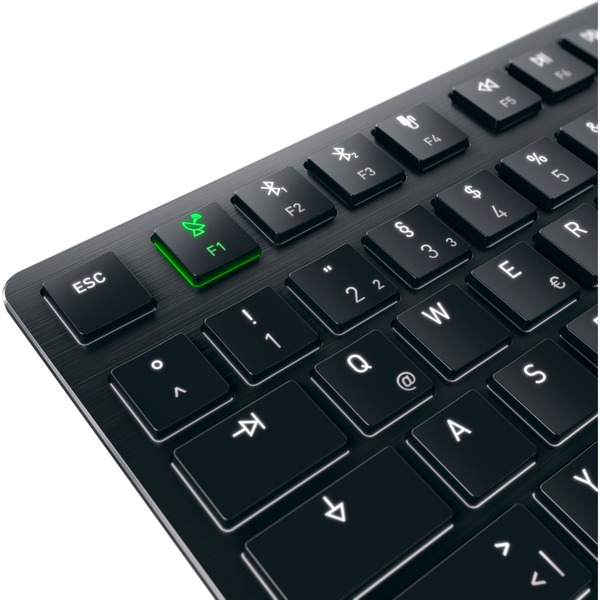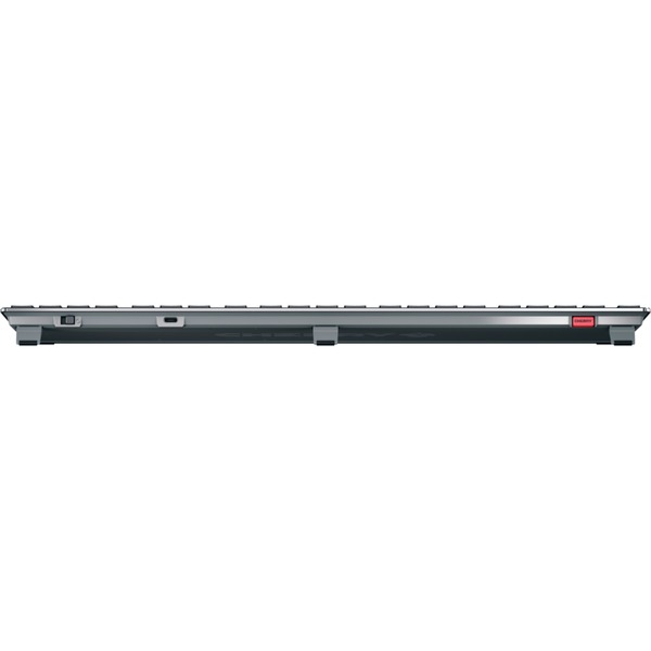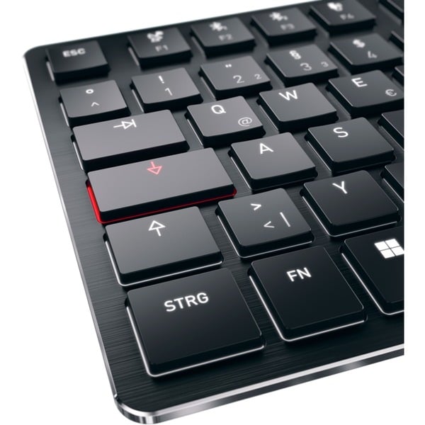 Besonderheiten Multi-Device-Tastatur (2 Bluetooth-5.2-Kanäle, 1 2,4-GHz-Funk- und 1 Kabelkanal für bis zu 4 Geräte), farbige LEDs für Status- und Sondertasten, RGB-LED für Ladestandsanzeige in der CHERRY Taste, AES-128 Verschlüsselung, eloxierte Aluminiumplatte, Polycarbonat-Tastenkappen, Laserbeschriftung + UV Beschichtung, integrierter Lithium-Akku