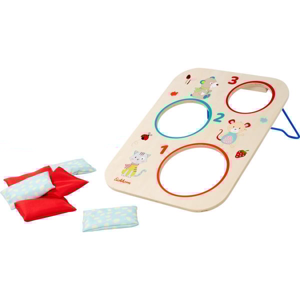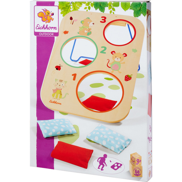 Das Eichhorn Wurfspiel ist das perfekte Geschicklichkeitsspiel für den Garten. Es besteht aus einem Spielbrett mit klappbarer Metallstütze und 6 Wurfsäckchen. Das Spielbrett hat drei Löcher in verschiedenen Größen, die Löcher sind mit unterschiedlichen Punktzahlen gekennzeichnet. Das Wurfspiel kann entweder alleine oder zu zweit bespielt werden. Jeder Spieler wirft seine Säckchen, wer nach der festgelegten Rundenzahl die höchste Punktzahl hat, gewinnt das Spiel. Das Eichhorn Wurfspiel ist für Kinder ab 3 Jahren geeignet.Art.-Nr.: 100125002