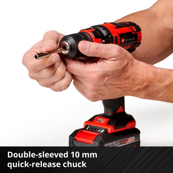 Der Akku-Bohrschrauber TC-CD 18/35 Li gehört zur Einhell Power X-Change Familie und leistet kraftvolles Bohren und Schrauben, flexibel, unabhängig von der Steckdose und jederzeit einsatzbereit. Das doppelhülsige Schnellspann-Bohrfutter des TC-CD 18/35 Li ermöglicht dank automatischer Spindelarretierung einen blitzschnellen Werkzeugwechsel. Mit der fein dosierbaren Drehzahl-Regelelektronik lässt sich die Kraft des Gerätes optimal an die Anforderungen von Material und Schrauben anpassen, während die Drehmoment-Rutschkupplung das Überdrehen von Schrauben zuverlässig verhindert. Die LED-Beleuchtung ermöglicht exaktes Arbeiten auch in dunklen und schwer zugänglichen Bereichen. Der Akku-Bohrschrauber TC-CD 18/35 Li liegt dank seiner schlanken Bauform und der ergonomischen Softgrip-Flächen besonders angenehm und sicher in der Hand. Das hochwertige Metallgetriebe sichert dabei eine effiziente Kraftübertragung und eine lange Lebensdauer. Die Power X-Change-Akkus können in allen Geräten der Einhell Lithium-Ionen-Systemreihe im Bereich Garten und Werkzeug verwendet werden.Art.-Nr.: 1710506