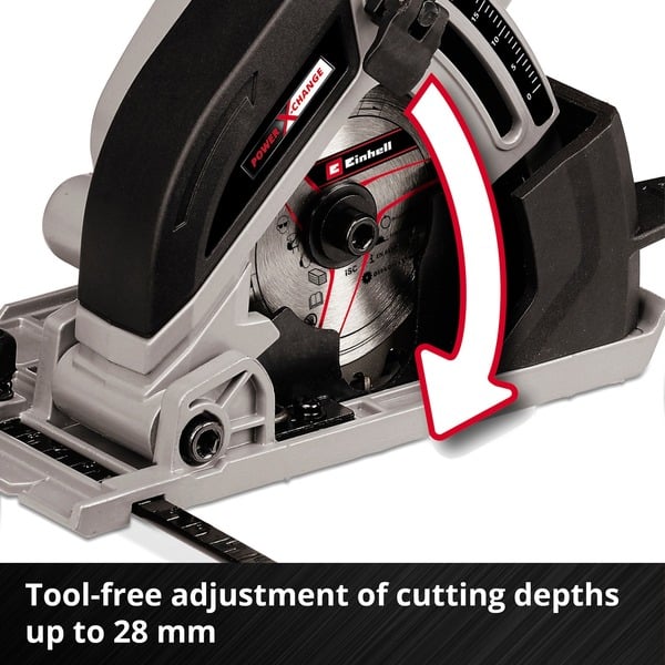 Die Einhell Akku-Mini-Handkreissäge TE-CS 18/89 Li-Solo ist extrem klein, leicht und handlich, besonders komfortabel in der Handhabung und angenehm beim Arbeiten. Störende Kabel, Stolperfallen und unerwünschte Ablenkung durch einen begrenzten Bewegungsspielraum gehören mit der Mini-Handkreissäge TE-CS 18/150 Li-Solo der Vergangenheit an. Die Handkreissäge wird von einem kraftvollen 18 Volt Lithium-Ionen-Akku (nicht im Lieferumfang enthalten) betrieben und arbeitet sich mit einer Drehzahl von bis zu 2.500 Umdrehungen pro Minute durch das zu bearbeitende Material. Für angenehmes Arbeiten sorgt auch die einfache, werkzeuglose Einstellung der Schnitttiefe. Dank der Spindelarretierung ist der Sägeblattwechsel denkbar leicht. Das hochwertige Hartmetall-Sägeblatt und der Parallelanschlag sorgen für saubere, exakte Schnitte, durch das 89mm-Sägeblatt wird eine Schnitttiefe von 28mm erreicht. Der Sägeschuh ist aus Aluminium und sehr hochwertig ausgeführt. Mit dem Staubabsaugadapter ist auch an die Sauberkeit am Arbeitsplatz gedacht.Art.-Nr.: 1755034