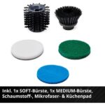 • Effiziente Reinigung: 2-stufige Drehzahlregulierung von 190 bis 350 U/min und werkzeugloser Bürstenwechsel für schnelle Ergebnisse.