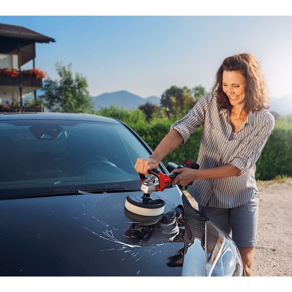Mit der Einhell Akku-Autopoliermaschine CE-CP 18/180 Li E-Solo lässt sich das Auto im Handumdrehen auf Hochglanz bringen. Dabei arbeitet der Anwender flexibel und ungebunden dank des leistungsstarken Lithium-Ionen Akkus. Die handliche und robuste Ausfertigung der Poliermaschine sorgt für Langlebigkeit, der Soft-Grip ermöglicht angenehmes und kräfteschonendes Arbeiten bei perfektem Halt. Die kraftvollen 500 bis 3.000 Schwingungen pro Minute und der Polierteller mit einem Durchmesser von 180 Millimetern sorgen dabei für Effektivität beim Polieren des Fahrzeugs. Sicherheit bieten ein gut erreichbarer Ein-/Ausschalter und der Überlastschutz. Mit der Textil-Polierhaube wird das Poliermittel auf die zu bearbeitende Oberfläche aufgetragen. Die Synthetik-Polierhaube erzeugt den dauerhaften Glanz beim Nachpolieren. Die CE-CP 18/180 Li E-Solo eignet sich zum Polieren von lackierten Oberflächen und zum Schleifen von Holz, Eisen, Kunststoff und ähnlichen Werkstoffen, je nach Verwendung des entsprechenden Schleifpapiers. Der dazugehörige Akku mit Ladegerät ist bei Bedarf separat erhältlich.Art.-Nr.: 1594054