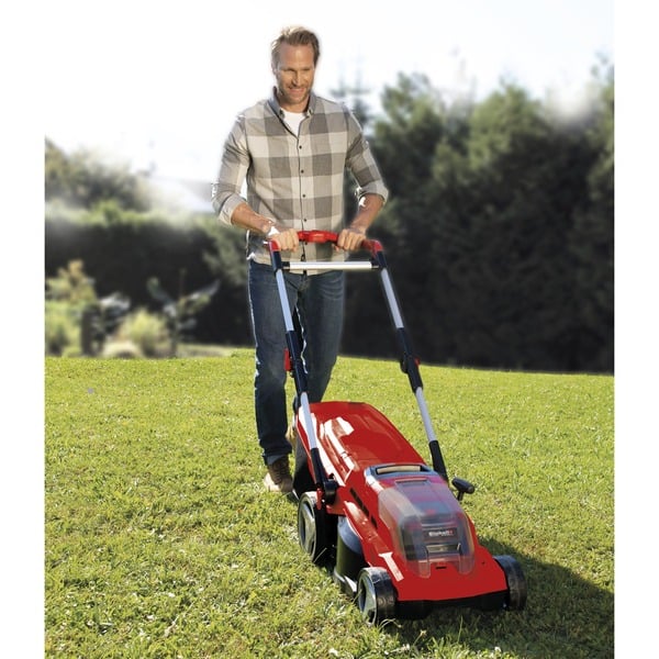 Der Akku-Rasenmäher GE-CM 36/37 Li von Einhell ist ein sehr hochwertiges, zuverlässiges und leistungsstarkes Gerät zum kabellosen Mähen kleiner und mittelgroßer Rasenflächen. Der Rasenmäher arbeitet mit zwei 18 Volt Akkus des Power X-Change Batteriesystems von Einhell. Das sorgt für angenehmes Arbeiten ohne lästiges Stromkabel. Die sechsstufige zentrale Schnitthöhenverstellung erlaubt die einfache Einstellung der Schnitthöhe von 25 bis 75mm. Der integrierte Rasenkamm ermöglicht auch randnahes Mähen. Der GE-CM 36/37 Li ist mit einem klappbaren, höhenverstellbaren Führungsholm mit Schnellspannhebeln ausgestattet und kann so platzsparend verstaut werden. Seine großflächigen Räder schonen zudem den Rasen. Der 45 Liter fassende Grasfangkorb ist mit einer Füllstandanzeige ausgestattet, so dass man sofort sieht, wann eine Leerung erforderlich wird. Ein praktischer Tragegriff sorgt für einfachen Transport. Die beiden mitgelieferten 4Ah Plus PXC Starter Kits enthalten je einen hochwertigen 4Ah Plus Akku und ein Schnellladegerät. Das aktive Batteriemanagementsystem (ABS) bietet Sicherheit, optimale Leistung und eine lange Lebensdauer der Akkus. Die Akkus sind resistent gegen Memory-Effekt und Selbstentladung. Das Schnellladegerät sorgt für kurze Ladezeiten und einen sicheren Ladevorgang. Jeder der Akkus verfügt über eine Akku-Füllstandanzeige mit drei LEDs, auf der sich der aktuelle Ladezustand auf einen Blick ablesen lässt. Der GE-CM 36/37 Li wird für Rasenflächen bis 400m² empfohlen.Art.-Nr.: 100118473