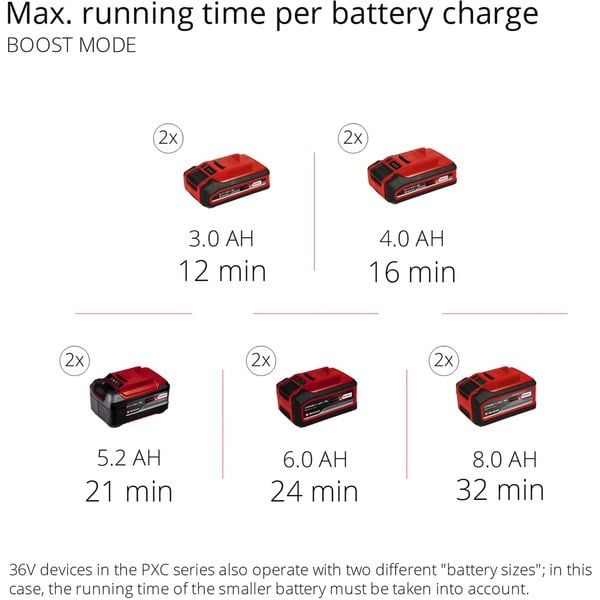 Weitere Informationen 2-Geschwindigkeiten (ECO (100mBar) / BOOST (150mBar)), 36 Volt (2x18V)