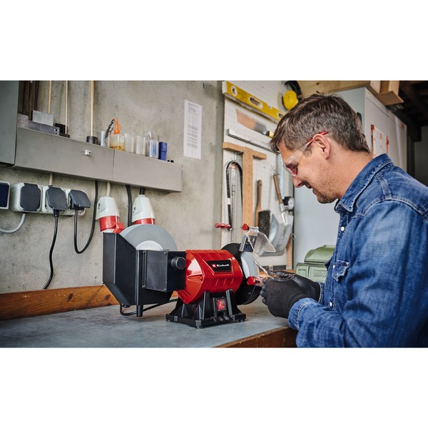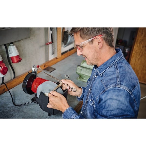 Der mit 4 Gummifüßen versehene Einhell Nass-Trockenschleifer TC-WD 200/150 ist eine praktische Kombination, einsetzbar für Nass- und Trockenschliff und damit ideal für jeden Heim- und Hobbyhandwerker. Mit dem Schleifer können Klingen jeder Art, Bohrer, Scheren oder Messer geschärft werden, ohne dabei das zu bearbeitende Werkstück zu beschädigen. Der Schneide wird beim Schleifen langsam Wasser zugeführt, dadurch wird Reibungshitze und ein Ausglühen der Scheibe verhindert. Der korrosionsfreie Wassertank kühlt dabei das Werkstück. Große, verstellbare Arbeitsauflagen unterstützen bei den unterschiedlichen Arbeiten, und die spielfreien, kugelgelagerten Wellen ermöglichen präzise Ergebnisse. Der TC-WD 200/150 verfügt über eine mit 134 U/min langsam laufende, feinkörnige Nassschleifscheibe und eine mit 2.980 U/min schnell laufende Trockenschleifscheibe. Das werkzeuglos einstellbare Funkenschutzglas und die seitlich geschlossenen Schutzhauben bieten dem Benutzer Sicherheit. Vier Gummifüße dämpfen die Vibrationen und sorgen für einen sicheren, festen Stand während der Arbeit.Art.-Nr.: 1758865
