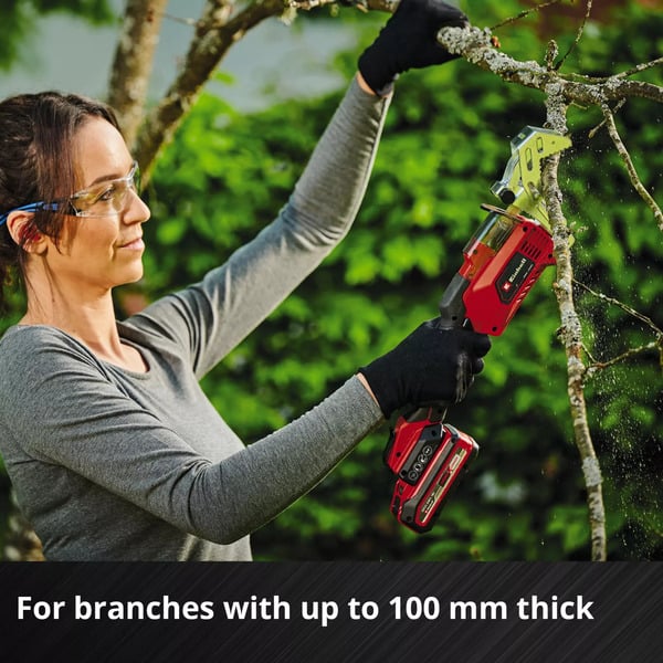 Die EINHELL Akku-Astsäge GE-GS 18/150 Li ist kompakt, leicht und schnell zur Hand. Die kabellose Astsäge schneidet mühelos auch sehr dicke Äste mit Durchmessern von bis zu 10cm. Das Sägeblatt kann schnell und einfach ohne Werkzeug gewechselt werden. Zum sicheren einhändigen Sägen verfügt die Astsäge über einen werkzeuglos abnehmbaren Astbügel, der einen besseren Halt am Ast gewährt und Abrutschen verhindert. Mit montiertem Astbügel können bis zu 8cm dicke Äste gesägt werden und auch höher gelegene Äste eingehakt und etwas herangezogen werden. Die Akku-Baumsäge GE-GS 18/150 Li ist mit zwei hochwertigen Sägeblättern „Made in Switzerland“ ausgestattet. Zum Schutz des Akkus ist die Astsäge mit einer schwingungsentkoppelten Batterieaufnahme ausgestattet, die die Übertragung von Vibrationen auf den Akku reduziert. Die Lieferung erfolgt ohne Akkus und ohne Ladegerät. Zum Betrieb der Astsäge GE-GS 18/150 Li-Solo ist ein separat erhältlicher 18 Volt-Systemakku aus der Power X-Change-Reihe erforderlich, wie er auch in den anderen Einhell Werkzeugen und Gartengeräten benutzt wird.Art.-Nr.: 100040210