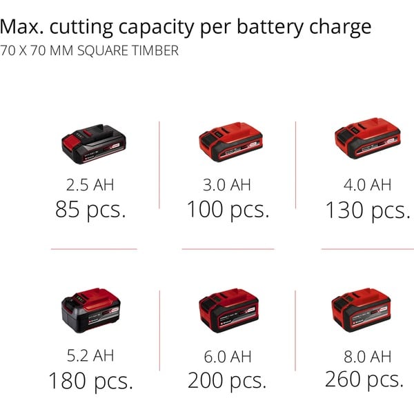Weitere Informationen Mit 3,0 Ah Akku kann man ca. 100 Schnitte ( 70 x 70mm Kantholz) durchführen