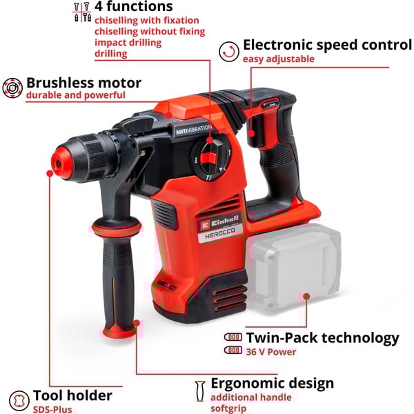 EINHELL Professional Akku-Bohrhammer HEROCCO 36/28, 36Volt (2x18Volt) (rot/schwarz, ohne Akku und Ladegerät)