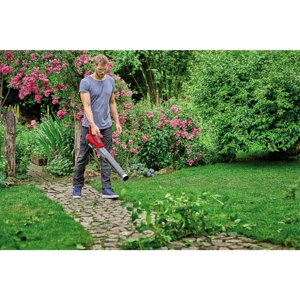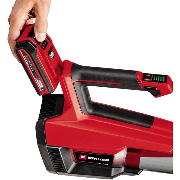 Der Professional Akku-Laubbläser GP-LB 18/200 Li E – Solo von Einhell ist ein leistungsstarkes Gerät, das eine schnelle und bequeme Reinigung von Grundstücksflächen, Höfen, Einfahrten, Gehwegen, Garagen, Terrassen und Gartenmöbeln ermöglicht. Das geringe Gewicht ermöglicht ein besonders komfortables, stromnetzunabhängiges Arbeiten. Mit der elektronischen Drehzahlregulierung mit praktischer, mehrstufiger LED-Anzeige lässt sich die Blasleistung präzise nach Bedarf dosieren. Die Axialgebläse-Technologie gewährt eine optimale Performance, und per Turboschalter kann man die maximale Blasleistung aktivieren. Das werkzeuglos abnehmbare Rohr lässt sich platzsparend aufbewahren. Der robuste Metallring am Rohrende dient als Stoßschutz und sorgt für eine lange Lebensdauer des Blasrohres. Dank Softgrip liegt der Akku-Laubbläser angenehm und sicher in der Hand. Der GP-LB 18/200 Li E – Solo verfügt außerdem über eine Akku-Füllstandsanzeige mit drei LEDs, auf der sich der aktuelle Ladezustand auf einen Blick ablesen lässt. Die Lieferung erfolgt ohne Akku und ohne Ladegerät. Zum Betrieb des Laubbläsers GP-LB 18/200 Li E – Solo ist ein separat erhältlicher 18 Volt-Systemakku aus der Power X-Change-Reihe erforderlich, wie er auch in den anderen Einhell Werkzeugen und Gartengeräten benutzt wird.Art.-Nr.: 1840179