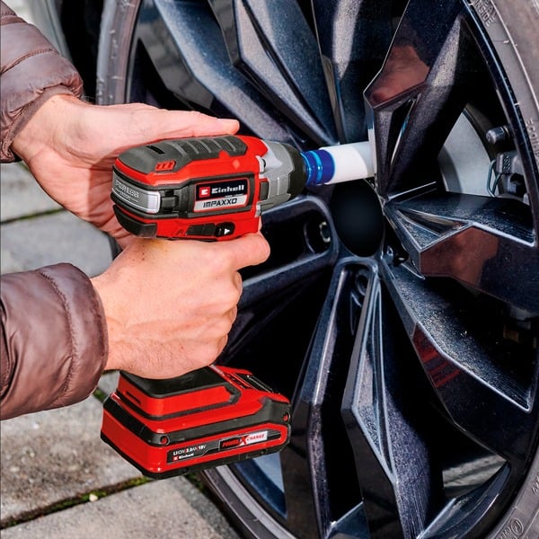Der Einhell Professional Akku-Schlagschrauber IMPAXXO 18/230 wird durch einen bürstenlosen Elektromotor angetrieben. Bürstenlose Elektromotoren sind weitaus effizienter und gleichzeitig kraftvoller als konventionelle Elektromotoren. Dadurch wird die Arbeitszeit mit einer Akkuladung maximal ausgereizt und die für anspruchsvolle Aufgaben notwendige Leistung zur Verfügung gestellt. Im Gegensatz zu Bürstenmotoren ist die Lebensdauer von Brushless-Motoren deutlich länger, außerdem fallen bei BL-Motoren keinerlei Wartungsarbeiten an. Mit 230 Nm dreht der Akku-Schlagschrauber mühelos große Schrauben ein, und eignet sich auch für den Autoreifenwechsel. Er ist für eine Vielfalt an Einsätzen im Haus, der Werkstatt und vor allem in der Garage geeignet. Der Schlagschrauber IMPAXXO 18/230 ist flexibel und ohne lästiges Kabel in jeder Situation einsetzbar. Der rutschfeste Griff mit den ergonomischen Softgripflächen ermöglicht ermüdungsfreies Arbeiten, und ein spezieller Schlag-Mechanismus schützt das Handgelenk dabei vor Drehkräften. Er ist mit einer robusten 1/2″ Außenvierkant-Aufnahme ausgestattet, die Leerlaufdrehzahl beträgt max. 2.900 Umdrehungen pro Minute. Die Drehzahl lässt sich stufenlos regulieren. Mit dem LED-Arbeitslicht bietet das Werkzeug rundherum eine gute Ausleuchtung. Bei aller Leistung ist der IMPAXXO 18/230 ein Leichtgewicht für sein Kaliber und damit bequem in der Handhabung. Die Lieferung erfolgt inklusive einem Bit-Adapter zum Schrauben, jedoch ohne Akku und ohne Ladegerät. Zum Betrieb des Akku-Schlagschraubers IMPAXXO 18/230 ist ein separat erhältlicher 18 Volt-Systemakku aus der Power X-Change-Reihe erforderlich.Art.-Nr.: 100008687