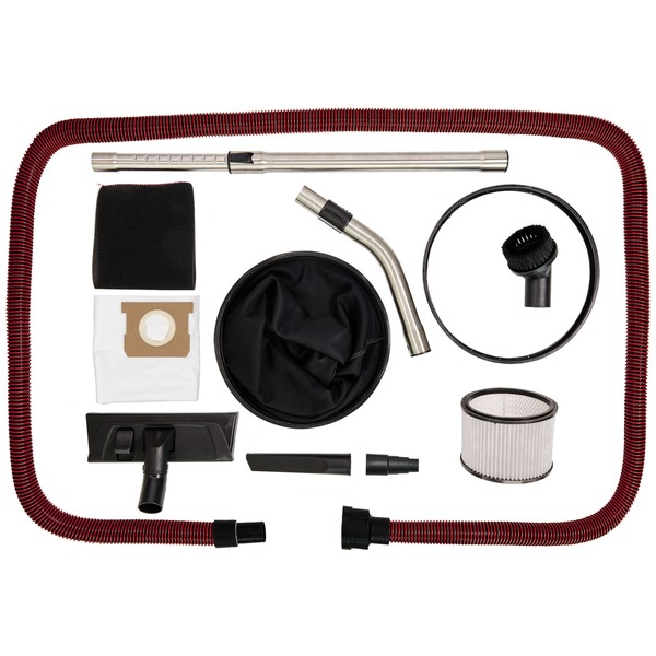 Zubehör vorhanden Edelstahl Teleskoprohr (Ø 36mm) mit Fehlluftregler, Plastiksaugschlauch (Ø 36mm), große Kombidüse, Fugendüse, Polsterdüse, HEPA-Faltenfilter, Schaumstofffilter, Filtersack, Vlies-Schmutzbeutel für 50 L Tank
