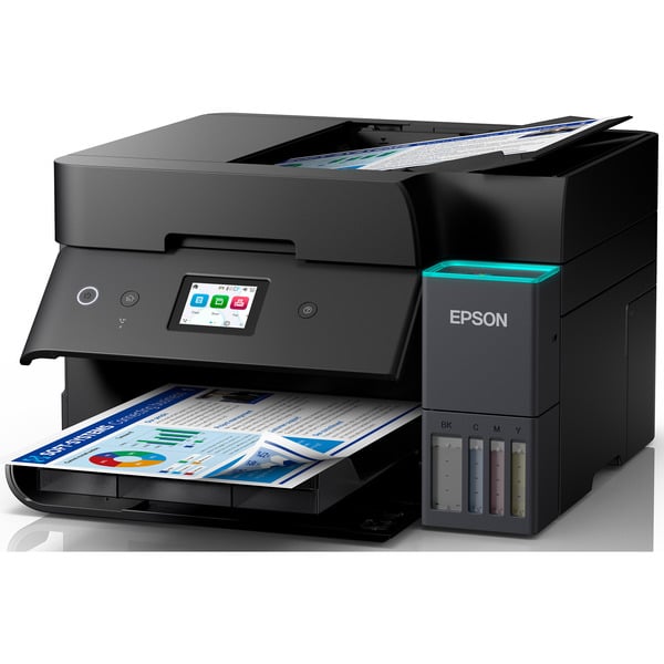 Effizientes Drucken mit Tinte und Multifunktion: Der EcoTank ET-4950 setzt auf Epsons Tintenflaschen-System, bei dem keine Tintenpatronen mehr genutzt werden, sondern Tinte direkt in einen Tank im Drucker eingefüllt wird. Das reduziert die Kosten und erhöht die Reichweite des Drucksystems. Der EcoTank ET-4950 kommt mit Tinten für eine Reichweite von bis zu 15100 Seiten Schwarzdruck (ISO) und 5500 Seiten Farbdruck (ISO) im Lieferumfang und bietet neben der Druckfunktion einen Flachbettscanner, eine Kopiereinheit und eine Faxschnittstelle. Darüber hinaus lässt er sich per WLAN oder LAN in ein Netzwerk integrieren. Mobilgeräte können über Wi-Fi direct mit dem Drucker kommunizieren. Den Überblick behalten Nutzer über das Farbdisplay an der Vorderseite, eine automatische Duplexeinheit ermöglicht effizienten beidseitigen Druck auf DIN A4-Normalpapier. Zur Eingabe von Kopier- oder Scanvorlagen ist ein 30 Blatt fassender Einzug an der Oberseite vorhanden.Art.-Nr.: 100151048