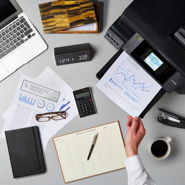 Effizientes Drucken mit Tinte und Multifunktion, minimalistisches Design mit einfacher Handhabung: Der EcoTank ET-5805 setzt auf Epsons Tintenflaschen-System, bei dem keine Tintenpatronen mehr genutzt werden, sondern Tinte direkt in einen Tank im Drucker eingefüllt wird. Das reduziert die Kosten und erhöht die Reichweite des Drucksystems. Der EcoTank ET-5805 kommt mit Tinten für eine Reichweite von bis zu 4500 Seiten Schwarzdruck (ISO) und 2800 Seiten Farbdruck (ISO) im Lieferumfang und bietet neben der Druckfunktion einen Scanner mit Einzug, eine Kopiereinheit und eine Faxfunktion. Darüber hinaus lässt sich dieser leistungsfähige Drucker für das Homeoffice oder kleine Arbeitsgruppen per LAN oder WLAN in ein Netzwerk integrieren. Mobilgeräte können über Wi-Fi direct, per Epson-App oder Apple AirPrint mit dem Drucker kommunizieren. Über den Farb-Touchscreen an der Vorderseite behalten Nutzer stets den Überblick über Druckvorgänge. Art.-Nr.: 100109043