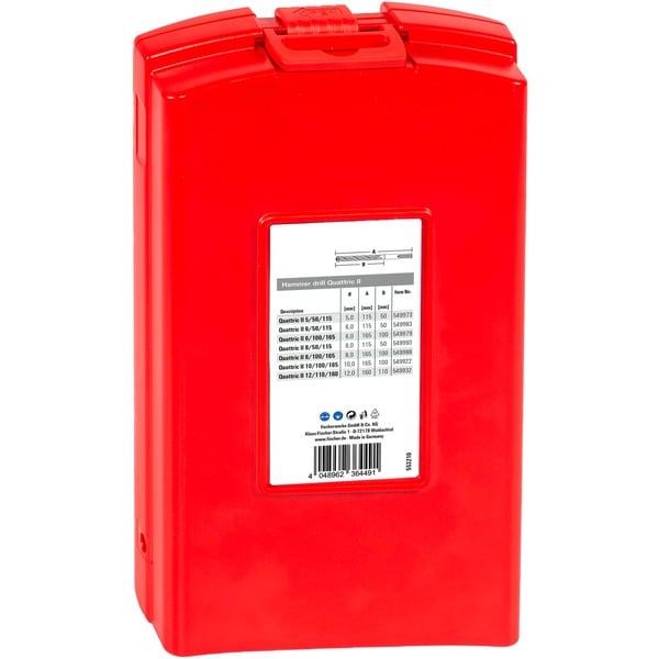 Der Hammerbohrer-Satz Quattric II Set von fischer enthält fünf Hochleistungs-Steinbohrer mit Hartmetall-Bohrkopf für eine lange Standzeit. Die Power Shoulders bieten eine verbesserten Aufbruchleistung in Beton, und die massiven Hauptschneidekanten sorgen für einen schnellen Bohrfortschritt. Die Armierungsphasen verhindern dabei das Einhaken in Armierungen. Die Zentrierspitze ermöglicht einfaches und punktgenaues Anbohren und verhindert das Verlaufen auf glatten Oberflächen, und die zweiteilige Wendel ermöglicht eine optimale Bohrmehlabfuhr. Die Verschleißmarke erlaubt die einfache Erkennung der Verschleißgrenze gemäß PGM. Der Hammerbohrer-Satz Quattric II eignet sich zum Dreh- und Schlagbohren, besonders auch für den Einsatz mit Akku-Schlagbohrschraubern.Art.-Nr.: 1826544