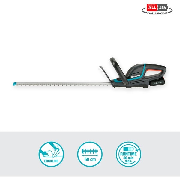 GARDENA Akku-Heckenschere ComfortCut 60/18V P4A, Ready-To-Use Set (grau/türkis, Li-Ion Akku 2,5Ah P4A, POWER FOR ALL ALLIANCE)