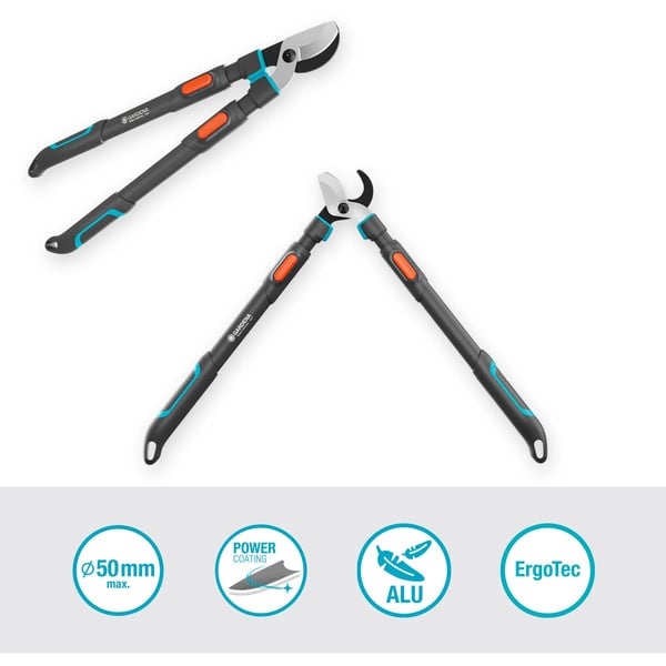 Die mechanische Astschere TeleCut Pro L von GARDENA zeichnet sich durch hohe Schneidkraft, ergonomische Form und dank der teleskopierbaren Aluminiumrohre durch geringes Gewicht aus. Sie besitzt eine Gesamtlänge von 65cm, die sich bis auf 90cm ausziehen lässt und eignet sich zum Schneiden von Holz mit einem Durchmesser bis 50mm. Die Bypass-Astschere verfügt über zwei scharfe, bis in die Spitzen präzisionsgeschliffene Klingen aus Qualitätsstahl, hergestellt aus exklusiver Legierung. Sie eignet sich damit ideal zum sauberen Rück- oder Pflegeschnitt frischer grüner Äste. Die antihaftbeschichteten Klingen liefern einen sauberen und glatten Schnitt. Die Beschichtung PowerCoating verbessert die Schneidleistung, schützt die Klingen vor Korrosion, und sorgt für eine leichte Reinigung. Durch das geringe Gewicht und die hervorragende Ergonomie fällt das Schneiden von Ästen mit der Astschere TeleCut Pro L leicht. Zusätzlich ist sie mit Anschlagspuffern ausgestattet, was die Handgelenke schont.Art.-Nr.: 100081884