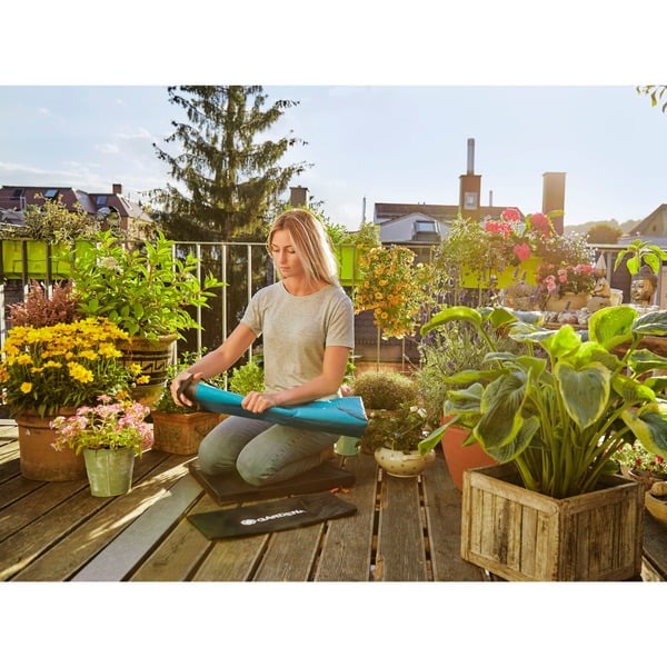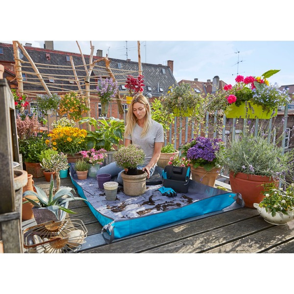 Die neuen GARDENA Pflanzmatten helfen dabei, dass es auf Balkon und Terrasse grünt und blüht, und beim Umtopfen alles sauber bleibt. Erde und Pflanzenteile, die danebenfallen, werden aufgefangen und können anschließend ganz leicht entsorgt werden. Die Kanten der Pflanzmatte L können auf Wunsch mit Druckknöpfen aufgestellt werden, dadurch entsteht ein Rand, und die Erde und Pflanzabfälle fallen nicht mehr auf den Tisch oder den Boden. Den Inhalt kann man anschließend einfach über dem Kompost oder dem Mülleimer entleeren, dazu befindet sich in der Mitte eine verschließbare Öffnung. Die city gardening Pflanzmatte L misst 120cm x 180cm und ist aus wasserabweisendem Material hergestellt. An den Ecken befinden sich praktische Tragegriffe. Sie lässt sich einfach reinigen, ist unempfindlich gegen Schmutz und weicht nicht auf. Bei der Variante L ist ein zusätzliches Kniekissen im Lieferumfang enthalten, für bequemes Arbeiten auf dem Boden.Art.-Nr.: 1491522