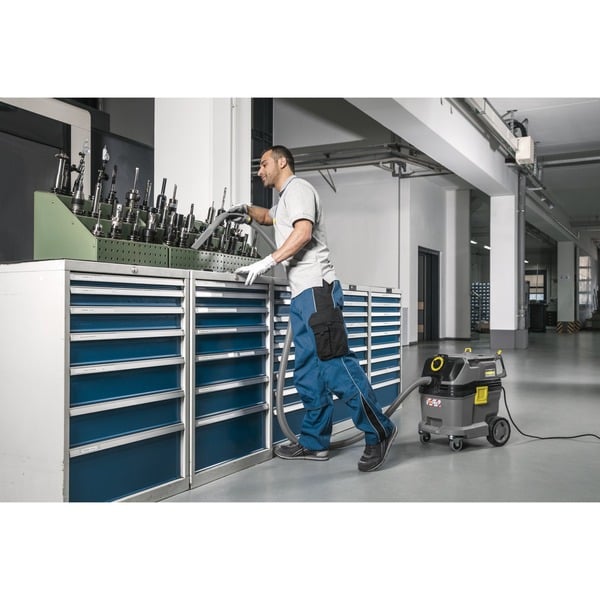 Zur effektiven und schnellen Reinigung von Maschinen, Fahrzeugen, Werkstätten und Baustellen: Der Kärcher Nass- und Trockensauger NT 30/1 Tact ist ein Universal-Gerät für professionelle Anwender aus den unterschiedlichsten Branchen. Der kompakte Allessauger überzeugt dank dem automatischen Filterabreinigungssystem Tact und dem feuchtigkeitsresistenten PES-Flachfaltenfilter bei der staubfreien Beseitigung großer Mengen Feinstaub über lange Arbeitsintervalle hinweg. Schmutz und Flüssigkeiten werden zuverlässig in einem robusten 30 Liter großen Behälter gesammelt, der über einen Bumper und stabile Metalllenkrollen verfügt. Das einfache Handling und die durch den neuen, zentralen Drehschalter kinderleichte Bedienung des Geräts, erleichtern die Arbeit enorm. Das Gerät ist komplett mit neu entwickeltem und stark verbessertem Zubehör ausgestattet, das sich in der integrierten Saugschlauch- und Zubehöraufnahme bequem verstauen lässt. Auf dem flachen Gerätekopf können Werkzeuge und Boxen dank gummierten Flächen und Verzurrmöglichkeiten verrutschsicher abgestellt oder sogar fixiert werden. Stabile Lenkrollen aus Metall ermöglichen gute Manövrierfähigkeit und uneingeschränkte Baustellengängigkeit Der robuste Behälter schützt das Gerät vor Stößen und Schlägen. Mit dem entnehmbaren Filtergehäuse lässt sich der Filter staubfrei entnehmen und wieder einsetzen. Das falsche Einlegen des Flachfaltenfilters wird unmöglich gemacht.Art.-Nr.: 1350312