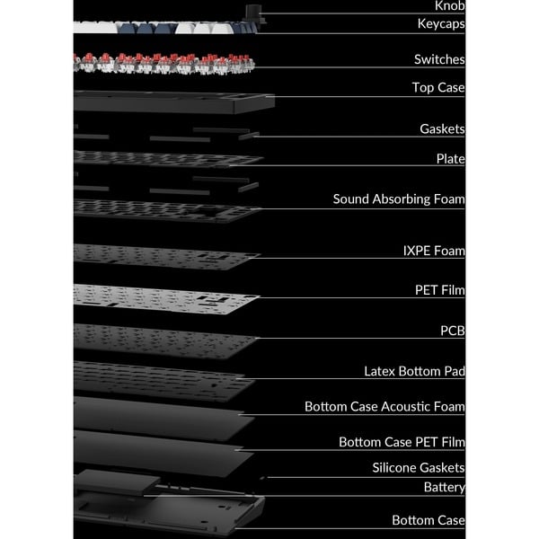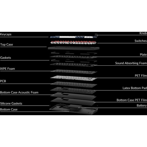 Weitere Informationen DE-ISO-Layout | Vollständig montierte Tastatur mit Drehregler inkl. Aluminiumrahmen, PCB, Leiterplatte, schalldämmender Schaumstoff, IXPE-Schaum, PET-Folie, Latex-Bodenpad, Akustikschaum und PET-Folie für das Bodengehäuse, 16 Gaskets (12 installiert, 4 in der Box), 6 Sets an Stabilisatoren, 1 Set an Double-Shot-PBT-Tastenkappen, 1 Set an Gateron Jupiter Tastenschaltern (vorgeschmiert) | Wiederaufladbarer 4000 mAh Li-Polymer-Akku | Akkulaufzeit: Bis zu 180 Stunden bei ausgeschalteter Hintergrundbeleuchtung, bis zu 100 Stunden bei eingeschalteter Hintergrundbeleuchtung (niedrigste Helligkeit) | Bluetooth-Version: 5.1 | Polling-Rate Bluetooth: 90 Hz