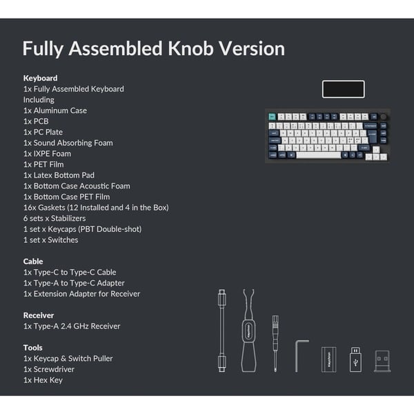 Zubehör vorhanden Windows-Tastenkappen, 2,4-GHz-USB-A-Empfänger, USB-C-Kabel, USB-A-auf-USB-C-Adapter, Erweiterungsadapter für den Empfänger, Tastenkappen- und Schalterabzieher, Schraubendreher, Innensechskantschlüssel