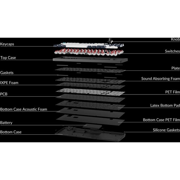 Weitere Informationen DE-ISO-Layout | Vollständig montierte Tastatur mit Drehregler inkl. Aluminiumrahmen, PCB, Leiterplatte, schalldämmender Schaumstoff, IXPE-Schaum, PET-Folie, Latex-Bodenpad, Akustikschaum und PET-Folie für das Bodengehäuse, 16 Gaskets (12 installiert, 4 in der Box), 4 Sets an Stabilisatoren, 1 Set an Double-Shot-PBT-Tastenkappen, 1 Set an Gateron Jupiter Tastenschaltern (vorgeschmiert) | Wiederaufladbarer 4000 mAh Li-Polymer-Akku | Akkulaufzeit: Bis zu 180 Stunden bei ausgeschalteter Hintergrundbeleuchtung, bis zu 100 Stunden bei eingeschalteter Hintergrundbeleuchtung (niedrigste Helligkeit) | Bluetooth-Version: 5.1 | Polling-Rate Bluetooth: 90 Hz
