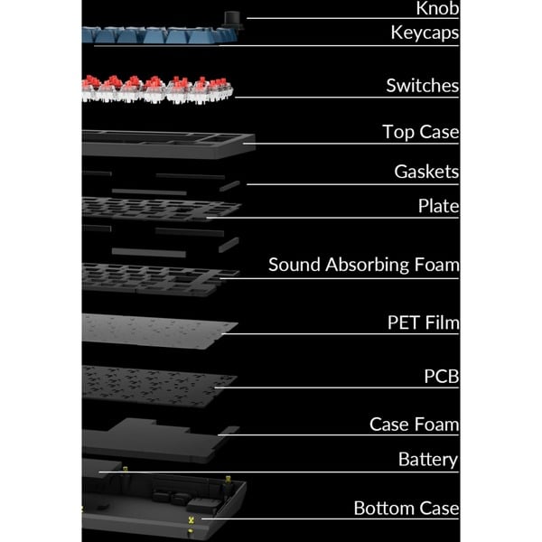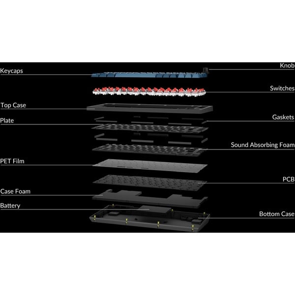 Weitere Informationen Vollständig montierte Tastatur inkl. PCB, PC-Platte, schalldämpfender Schaumstoff, 4 Sets an Stabilisatoren, Drehregler, 1 Set PBT-Tastenkappen und 1 Set Gateron Jupiter Tastenschalter (vorgeölt) | Wiederaufladbarer 4000 mAh Li-Polymer-Akku | Akkulaufzeit: Bis zu 225 Stunden bei ausgeschalteter Hintergrundbeleuchtung; bis zu 100 Stunden bei niedrigster Helligkeitsstufe | Bluetooth-Version: 5.1 | Polling-Rate im Bluetooth-Modus: 90 Hz