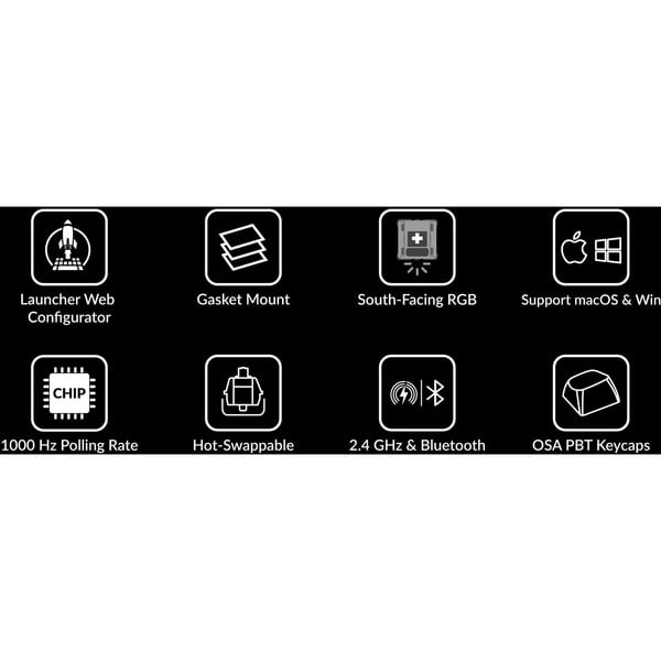 Besonderheiten Verbindung mit bis zu 3 Geräten | Nicht-Durchscheinende Double-Shot PBT-Tastenkappen mit OSA-Profil (OEM-Höhe, SA-Form) | Programmierbarer Drehregler | Nach Süden ausgerichtete RGB-LEDs | Eingeschraubte PCB-Stabilisatoren | Vollständige QMK- und VIA-Unterstützung | macOS-Windows-Umschalter | Tippwinkel: 3,5º, 7,1º und 9,5º | ABS-Rahmen