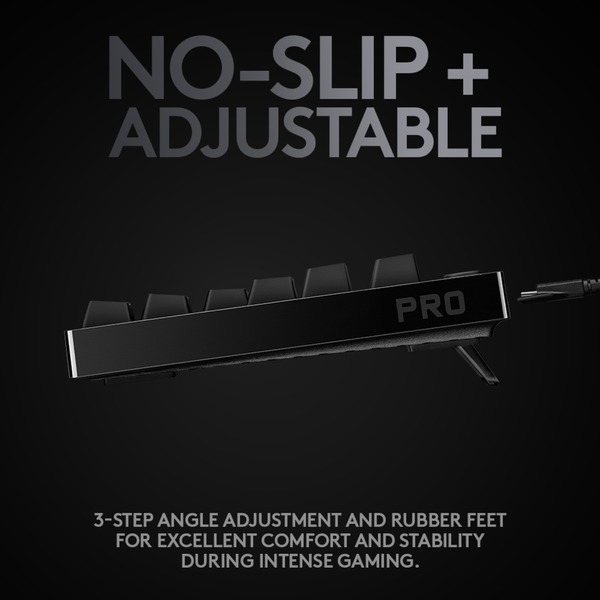 Die Logitech G PRO ist eine speziell für Pro-Gamer entwickelte mechanische Gaming-Tastatur. Die von Profis getestete, turniererprobte und für Sieger konzipierte G PRO bietet kompaktes Design und klickende Switches in professioneller Qualität. Die fortschrittlichen mechanischen GX Clicky Switches sind auf Leistung, Reaktionsfähigkeit und Strapazierfähigkeit ausgelegt und bieten eine hörbare und taktile Rückmeldung. Das Design ohne Nummernblock und abnehmbarem Kabel sorgt für mehr Platz für Mausbewegungen und leichtere Handhabung auf Reisen zu Turnieren in aller Welt. Die RGB-Beleuchtung und Animationen lassen sich mit der G HUB-Software anpassen und statische Beleuchtungsdesigns für Turniersysteme im integrierten Speicher sichern. Wenn es beim Spielen hoch hergeht, halten Gummifüße die Tastatur in Position, wobei sich der Winkel der G PRO in drei Stufen verstellen lässt, um diese in die gewünschte Position zu bringen. Komplexe, zeitgesteuerte Aktionen und Befehle für F1-F12 mit lassen sich ebenfalls mit der Logitech G HUB Software programmieren.Art.-Nr.: 1656905