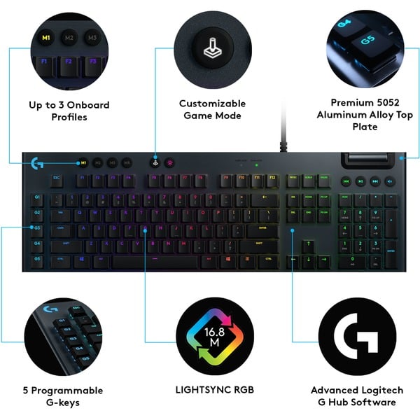 Besonderheiten Integrierter Speicher: 2 Beleuchtungsprofile, 3 Profile für G-Tasten-Makros | LIGHTSYNC RGB, pro Taste anpassbare RGB-Beleuchtung | 5 spezielle G-Tasten | Logitech G HUB Software
