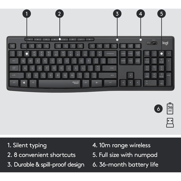 Das Logitech MK295 ist ein leises, kabelloses Desktop-Set aus Tastatur und Maus mit SilentTouch-Technologie, die bei gleichem, vertrautem Tipp- und Klickgefühl störende Geräusche um über 90 % reduziert. Die starke, zuverlässige kabellose 2,4-GHz-Verbindung ermöglicht das Arbeiten in bis zu 10 m Entfernung. Die Tastatur bietet einen Nummernblock und acht praktische Shortcut-Tasten für eine leichtere Steuerung und effizientere Dateneingabe. Die Maus ermöglicht bequemes Klicken dank der ergonomisch gestalteten Form. Sie funktioniert auf vielen Oberflächen und sorgt für geschmeidige Bewegungen durch die fortschrittliche optische Spurführung. Das Logitech MK295 Desktop-Set ist mit Chrome OS und Windows auf Laptop und PC kompatibel und lässt sich dank Plug&Play direkt in Betrieb nehmen.Art.-Nr.: 1673456