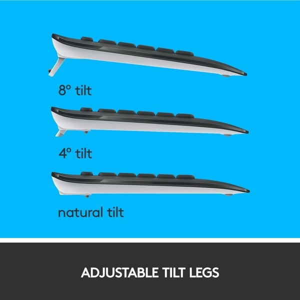 Besonderheiten Standard-Tastenanordnung mit Funktionstasten, Ziffernblock und Pfeiltasten in Standardgröße | Tastenabstand 19 mm | Flüsterleise Tasten (weniger als 55 dB) | Personalisierter Bedienkomfort: Natürlicher Neigungswinkel, 4° Neigungswinkel und 8° Neigungswinkel | UV-beschichtete, verschleißfeste Tasten | Spritzwassergeschützt für bis zu 60 ml Flüssigkeitseinwirkung | Feststellanzeige | Handballenauflage | Maus in Standardgröße mit geschwungenem Design und weichen Gummi-Griffflächen | Aufbewahrungsfach für den Empfänger in der Maus | Logitech Unifying-USB-Empfänger – Pairing von bis zu 6 Produkten über einen winzigen Empfänger