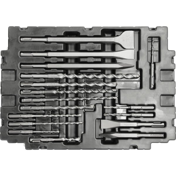 Inhalt 12 Hammerbohrer Ø x Gesamtlänge 5×110, 5×160, 6×110, 6×160, 7×110, 7×160, 8×110, 8×210, 10×160, 10×210, 12×210, 14x260mm, 2 Spitzmeißel 140mm und 250mm, 2 Flachmeißel 20x140mm und 20x250mm, 1 Breitmeißel 40x250mm