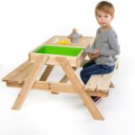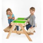 Diese Matsch- und Sitzgarnitur aus Holz ist nicht nur eine tolle Sitzgelegenheit für Kinder, sondern auch ein Matsch-Spielplatz im Kleinformat. Durch Entfernen der beiden Tischplatten werden zwei grüne Plastikboxen sichtbar, die herausgenommen und mit Wasser oder Sand gefüllt werden können. Sie können aber auch als Stauraum für Spiel- und Malsachen genutzt werden. Jede Box hat ein Fassungsvermögen von etwa 5 Litern. Art.-Nr.: 100094368