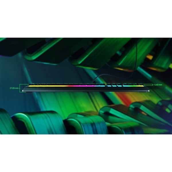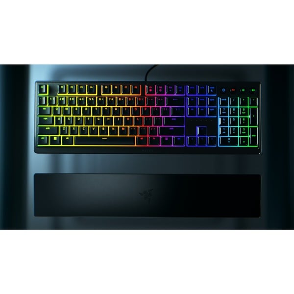 Besonderheiten Low-Profile-Tasten, Anti-UV-beschichtete ABS-Tastenkappen, On-the-fly-Makroprogrammierung für alle Tasten, Gaming-Modus, magnetische Soft-Touch-Handgelenkauflage, Optionen zur Kabelführung, Razer Hypershift-Technologie, Razer Chroma RGB