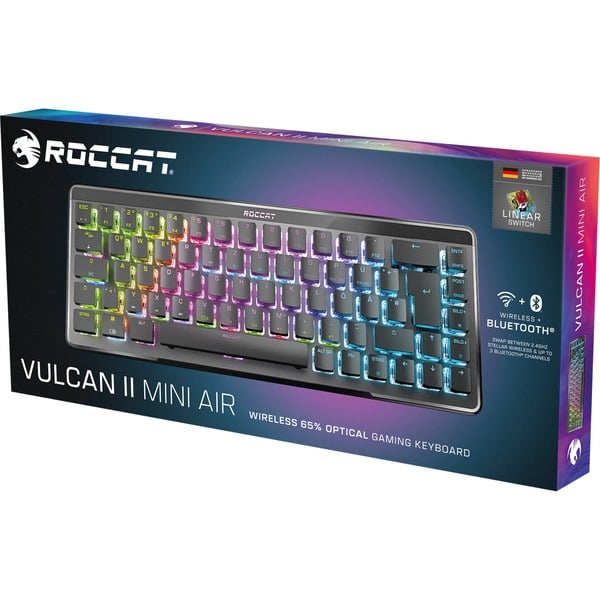 Die optisch-mechanische Roccat Vulcan II Mini Air Gaming-Tastatur kombiniert Performance und Funktionalität in einem kabellosen Miniformat. Mit 65 % der Größe einer Standard-Tastatur lässt sie jede Menge Platz für große Mauspads sowie ausholende Mausbewegungen in reaktionsschnellen Spielen und behält dabei die Pfeiltasten-Funktionalität, was sie ideal für die Ausstattung jedes Gaming-Enthusiasten macht. Dabei bietet die Vulcan II Mini Air kabellose Freiheit mit 2,4-GHz-Stellar-Wireless in Gaming-Qualität sowie drei Bluetooth-Kanälen zum nahtlosen Wechseln zwischen den Geräten. Die exklusiven Roccat Titan II Optical Red Switches verfügen über eine sanfte, lineare, ultraschnelle Betätigung und eine unglaubliche Haltbarkeit mit einer Lebensdauer von 150 Millionen Klicks, die Spiel für Spiel einen Wettbewerbsvorteil bieten. Sie sind zudem kompatibel mit vielen Drittanbieter-Tastenkappen mit kreuzförmigem Befestigungsaufsatz, damit man den Look der Vulcan II Mini Air ganz individuell anpassen kann. Im Spielmodus hat man Zugriff auf die Easy-Shift [+] Tasten-Duplizierungstechnologie, welche Tasten-Zweitfunktionen ermöglicht, wodurch sich nahezu unbegrenzte Tasten-Programmierungsmöglichkeiten ergeben. Dabei ist immer sofort ersichtlich, welche Tastenbefehle man eingibt, da die Doppel-LEDs der 29 multifunktionalen Smart-Tasten anzeigen, wenn die Zweitfunktion aktiv ist. Bis zu fünf Profile mit individuell angepassten Einstellungen für Beleuchtung, Tastenzuweisungen und mehr können direkt auf der Tastatur gespeichert und überallhin mit hingenommen werden. Die Vulcan II Mini Air verfügt darüber hinaus über eine Außenhülle aus eloxiertem Aluminium, die ihre strukturelle Integrität verstärkt, und ist kompatibel mit Roccats AIMO-Beleuchtungstechnologie, die ohne weitere Konfiguration fantastische RGB-Leuchteffekte erzeugen und mit anderen kompatiblen AIMO-fähigen Produkten für ein unglaublich immersives Lichtspektakel synchronisiert werden kann.Art.-Nr.: 100010406