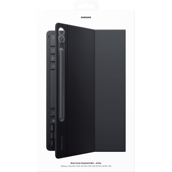 Das einteilige Book Cover Keyboard Slim von SAMSUNG mit vollwertiger QWERTZ-Tastatur und Anschluss über POGO-Pin passt optimal an das Samsung Galaxy Tab S10+ | S9+ | S9 FE+. Mit der AI-Taste kamm man auf den KI-gestützten Assistenten zugreifen: Einfach auf die entsprechende Taste tippen und dem KI-Assistenten die Bearbeitung der Anfrage überlassen. Die Tastatur mit Funktionstasten kombiniert mit dem DeX-Modus ermöglicht ein PC-ähnliches Erlebnis mit nur einem einfachen Tastendruck. Mit Wireless Keyboard Sharing kann man sich ganz einfach mit anderen kompatiblen Galaxy Geräten verbinden und problemlos zwischen ihn wechseln, auf ihnen schreiben oder navigieren. Das schlanken und leichten Book Cover Keyboard Slim lässt sich schnell und einfach durch die Magnete in der Rückseite des Covers anbringen. Außerdem verfügt es über eine extra Aufbewahrungsmöglichkeit für den S Pen (separat erhältlich), sodass man ihn schnell zur Hand hat und er so nicht so schnell verloren geht.Art.-Nr.: 100094328