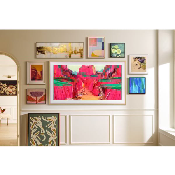Der Samsung GQ65LS03FWUXZG The Frame Pro ist ein Nano-QLED-Fernseher mit Mini-LED-Technologie, der im ausgeschalteten Zustand einem Kunstwerk gleicht und das Wohnzimmer in eine beeindruckende Kunstgalerie verwandelt. Dank des eleganten, mit separat erhältlichem Zubehör anpassbaren Rahmens und eines Displays mit matter, reflexionsfreier Oberfläche wirkt er wie ein Bild an der Wand, in dem eine heruntergeladene oder auch eigene Galerie angezeigt werden kann. Im Art-Mode setzt er wunderschöne Kunstwerke in Szene, die dank QLED-Technologie, Quantum Dots und HDR 10+ wie echte Gemälde wirken. Selbstverständlich verfügt dieses Gerät bei einer Diagonale von 163 cm (65″) über einen integrierten Triple-Tuner mit Aufnahmefunktion zum Fernsehen sowie WLAN, Bluetooth und eine breite Palette integrierter SmartTV-Funktionen für besonders einfaches Streaming zahlreicher Inhalte. Die externe Wireless-One-Connect-Box beinhaltet alle Anschlüsse des Fernsehers, und so wird eine Verbindung zum TV überflüssig.Art.-Nr.: 100135886