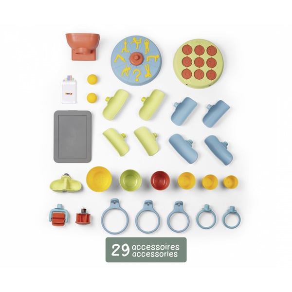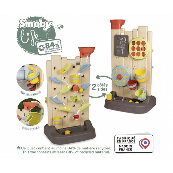 Die Life Activity Wall von Smoby ist eine vielseitige Spielwand, die mit ihren 6 Aktivitäten und 29 Zubehörteilen Kinder ab 2 Jahren begeistert. Die interaktive Wand bietet auf der einen Seite spannende Wasserspiele: Kinder können hier ihre eigenen Wasser- und Ballbahnen kreieren und dabei Rinnen, Becher, Schaufelräder und einen Wasserbehälter nutzen. Auf der anderen Seite lädt die Wand zu kreativen und sportlichen Aktivitäten ein. Ein Tic-Tac-Toe-Spiel, eine Schreibtafel, eine Sport-Rad-Aktivität und ein Wurfspiel bieten jede Menge Abwechslung. Diese Spiele fördern nicht nur die Motorik, sondern auch logisches Denken und soziale Interaktionen. Gefertigt aus einem hohen Anteil an recyceltem Kunststoff und UV-beständig, ist die Wand sowohl für den Innen- als auch Außenbereich geeignet. Dank ihrer robusten Bauweise und einfachen Reinigung ist sie ideal für den Garten, die Terrasse oder das Kinderzimmer. Art.-Nr.: 100125199