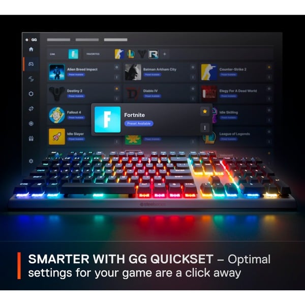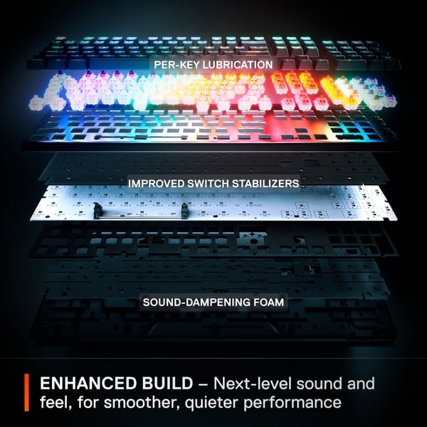 Besonderheiten OLED Smart Display, GG QuickSet, einstellbarer Auslöseweg von 0,1 bis 4,0 mm mit 40 individuellen Anpassungsmöglichkeiten, Hall-Effect-Magnetsensoren, Double-Shot PBT-Tastenkappen, Rahmen aus Aluminium in Luftfahrtqualität, dreilagiger geräuschdämpfende Schaumstoff, vorgeschmierte Schalter, verbesserte Stabilisatoren, magnetische Handgelenkauflage mit Soft-Touch-Finish, PrismSync-Beleuchtung