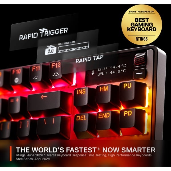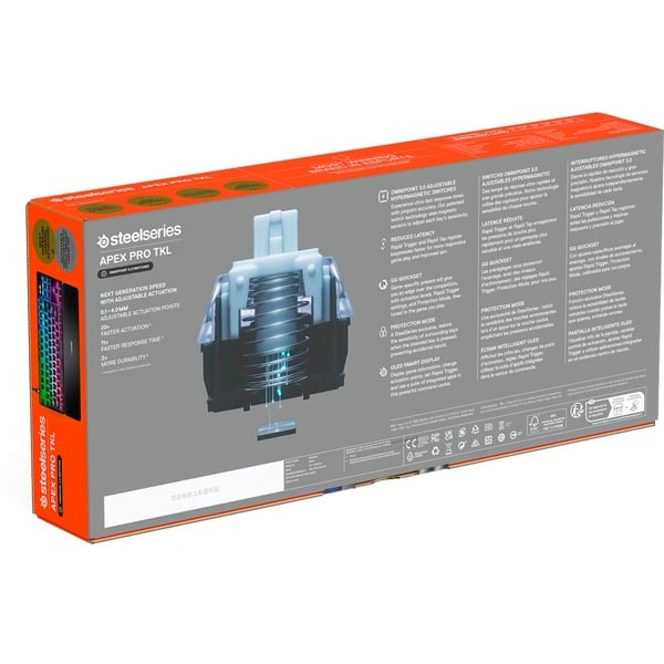 Die SteelSeries Apex Pro TKL Gen 3 ist die schnellste Gaming-Tastatur aller Zeiten im TKL-Format. Ihre weltweit schnellsten und fortschrittlichsten OmniPoint 3.0 Switches eignen sich für jeden Anwendungsfall, egal ob es darum geht, Gegner mit rasanter Geschwindigkeit zu eliminieren oder mit höchster Präzision zu tippen. Die Schalter liefern ein 20-mal schnelleres Ansprechverhalten und eine 11-mal schnellere Betätigung. Die hochmodernen Magnetsensoren sorgen für geringstmögliche Reaktionszeiten. Die Distanz bis zum Auslösen jeder Taste kann von 0,1 mm bis 4,0 mm in Abständen von 0,1 mm festgelegt werden. Über das OLED Smart-Display der Apex Pro TKL Gen 3 kann man sich wichtige Informationen wie GPU-Auslastung oder Benachrichtigungen anzeigen lassen, zwischen Profilen hin und her wechseln und Einstellungen vornehmen. Dank GG QuickSet kann man sich einen Wettbewerbsvorteil mit Voreinstellungen verschaffen, die Auslösestufen, Rapid Trigger, Protection Mode, Rapid Tap, RGB-Beleuchtung und mehr empfehlen. Die Double-Shot PBT-Tastenkappen bieten Langlebigkeit und erstklassige Haptik und der dreilagige geräuschdämpfende Schaumstoff, die vorgeschmierten Schalter und die verbesserten Stabilisatoren sorgen dafür, dass die Tastenanschläge besser klingen als ASMR und sich geschmeidiger anfühlen als der letzter Triple Kill. Die Deckplatte der Apex Pro TKL Gen 3 ist aus demselben robusten Aluminium gefertigt, das auch in Jets verbaut ist, um selbst höchsten Anforderungen gerecht zu werden und die magnetische Handgelenkauflage mit Soft-Touch-Finish sorgt zudem für den nötigen Komfort bei langen Gaming-Sessions.Art.-Nr.: 100076108