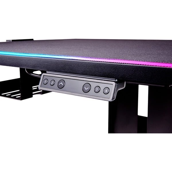 Ausstattung Kabelmanagement, RGB LED Lighting Strip: 16.8 Millionen Farben, Software iTAKE Gaming Engine, Eingangsspannung 5 Volt, WiFi-Dongle: WiFi Control Box, Eingangsspannung 5 Volt, USB 2.0-Anschluss (9 Pin), kompatibel mit Windows 7, 8, 8.1, 10, 11, elektrisch höhenverstellbar, Motor: Eingang 110-240 Volt, 50/60Hz, 1.5 Ampere Ausgang 29 Volt, 2.5 Ampere, Geschwindigkeit 38 mm/s, Single Motor mit Stage Lifting System, Controller: Standard 2-Tasten und Speicher 4-Tasten
