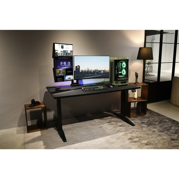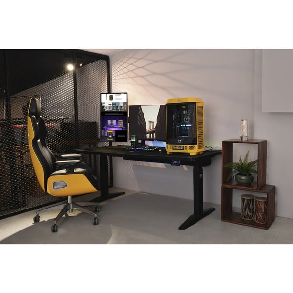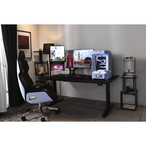 Der G700 RGB Gaming Desk von Thermaltake definiert die Platzausnutzung auf dem Schreibtisch neu und bietet unendlich viele Möglichkeiten für das Setup. Er verbindet äußeres Design mit Funktionen, die sowohl für den Einsatz im Büro als auch fürs Zocken konzipiert wurden. Das ultimative Ablagesystem des G700 ist ein einzigartiges und fortschrittliches Merkmal. Es verfügt über ein unverwechselbares zweiteiliges Tischplattendesign, wobei die eigentliche Tischplatte aufklappbar ist und direkten Zugriff auf das darunter liegende Kabelmanagementfach bietet, was für einen aufgeräumten Arbeitsbereich sorgt und die Kreativität fördert. Der G700 lässt sich elektrisch zwischen 61cm und 125cm stufenlos in der Höhe verstellen und bietet die Möglichkeit, zwei Positionen zu speichern. Die innovative Screen Glide-Schiene aus hochwertiger Aluminiumlegierung ermöglicht auch bei Verwendung eines Monitor Arm die flexible Neupositionierung von Monitoren. Der 6-Tasten-Controller sorgt für einfache Bedienung und die digitale Anzeige informiert über die genaue Höheneinstellungen. Das intelligente Bedienfeld verfügt über langlebige schwarze Schalter und kann bis zu zwei Höhenspeichereinstellungen vornehmen. Zur Wahl stehen sieben verschiedene Lichteffekte (Statisch, Buntes Neon, Flimmern, Buntes Flimmern, Reaktiv, Spectrum Running).Art.-Nr.: 100076765